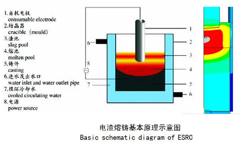 All'inizio del processo ESRC, sul fondo di un crogiolo si forma una pozza di scorie fuse con una profondità di 100-200 mm. Quando l'elettrodo consumabile collegato a una fonte di alimentazione viene immerso nella scoria fusa, una forte corrente elettrica passa attraverso la vasca di scorie, producendo calore per aumentare la temperatura delle scorie. Quando la temperatura delle scorie supera il punto di fusione dell'elettrodo consumabile, l'elettrodo fonde per formare goccioline di acciaio sulla superficie che poi cadono attraverso la vasca di scorie a causa della gravità. In questo processo, gli elementi nocivi e le impurità nell'elettrodo consumabile vengono ridotti. L'acciaio fuso forma una pozza di metallo sotto la pozza di scorie. Raffreddato dall'acqua in circolazione, l'acciaio fuso si solidifica gradualmente e alla fine forma una colata. Nel processo ESRC, la fusione dell'elettrodo consumabile, la raffinazione dell'acciaio fuso, il riempimento del crogiolo e la solidificazione procedono continuamente a turno fino a quando il crogiolo è completamente riempito e quindi viene realizzata una colata dal basso verso l'alto.